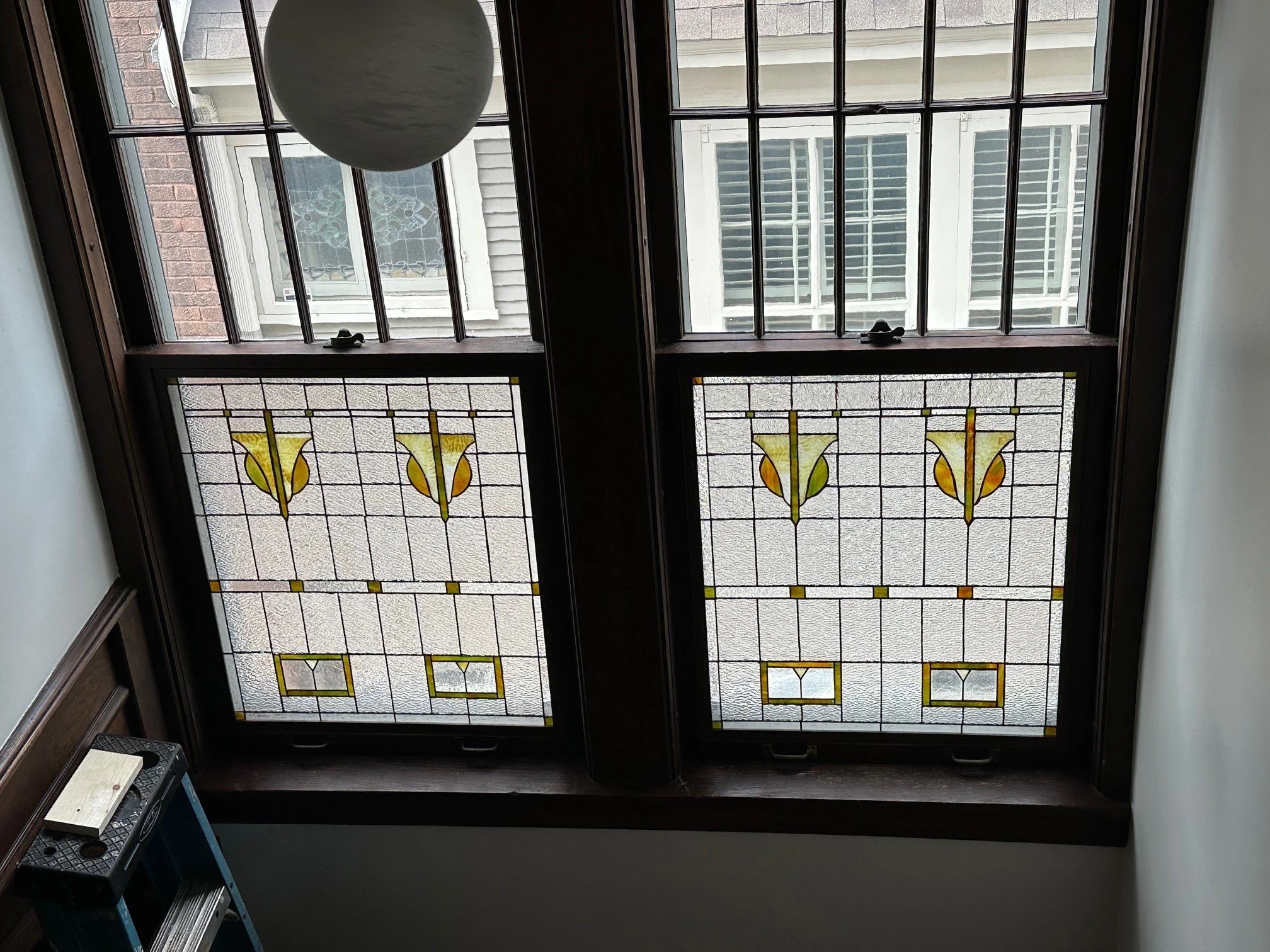 These are commissioned pieces designed to fit into window openings in a staircase in a home in the Summit Hill neighborhood of St. Paul, MN. The design and colors are made to compliment stained glass in the existing cupboard doors of the home’s dining room.