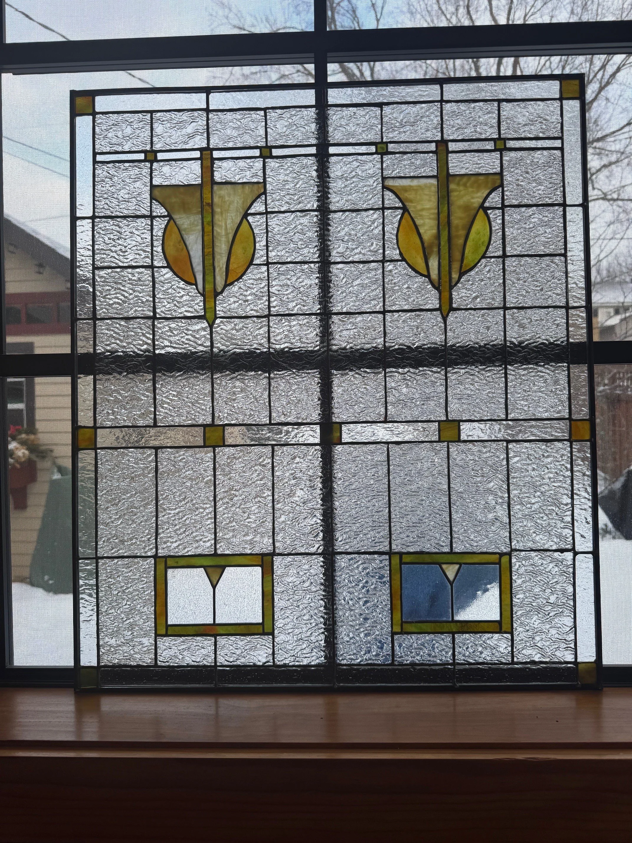 This piece is one of two that were commissioned to fit into windows that are in a staircase in a home in the Summit Hill neighborhood in Saint Paul, MN.