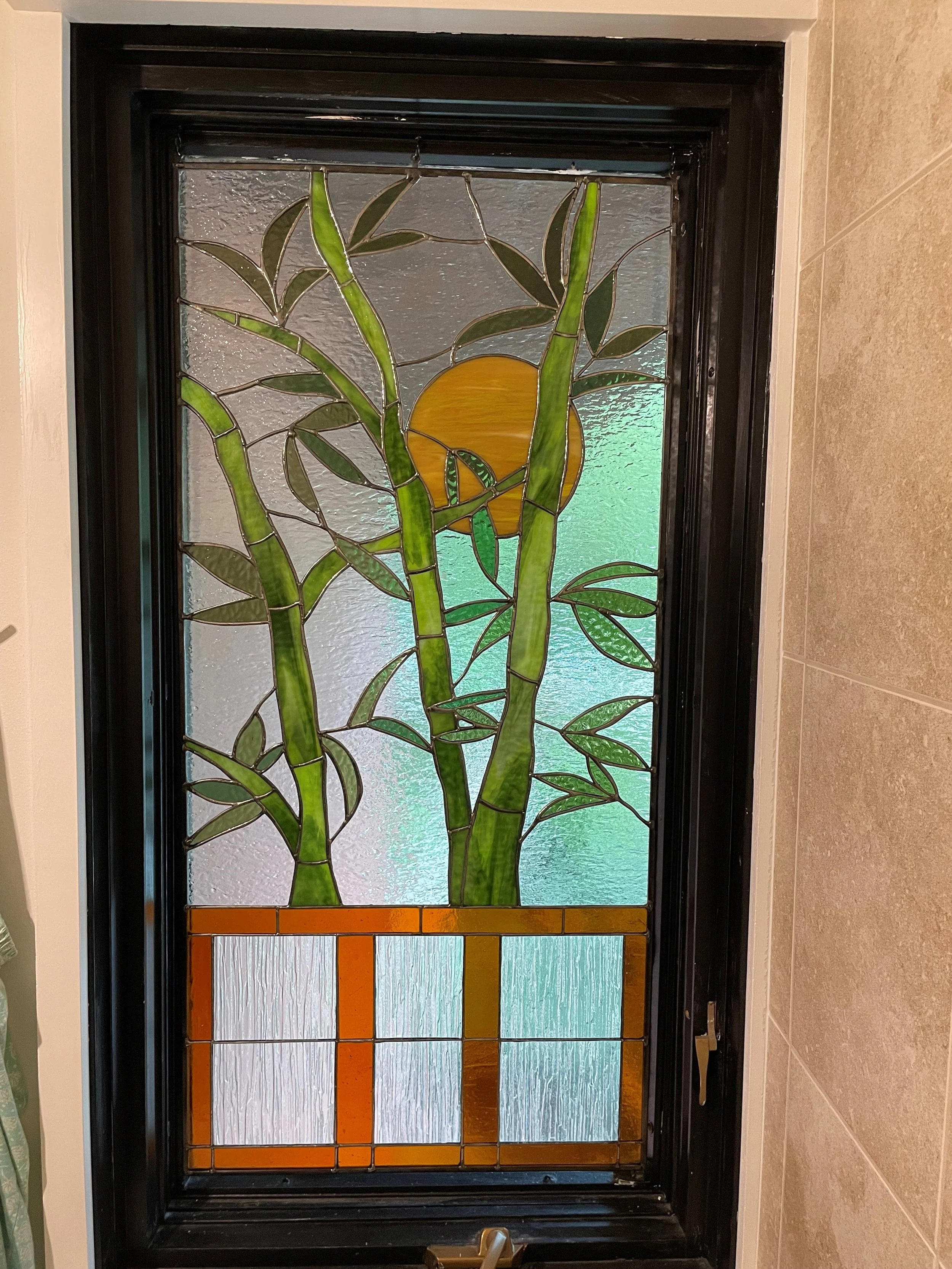 This piece was designed and installed to fit into a bathroom window in a home in Middleton, WI.